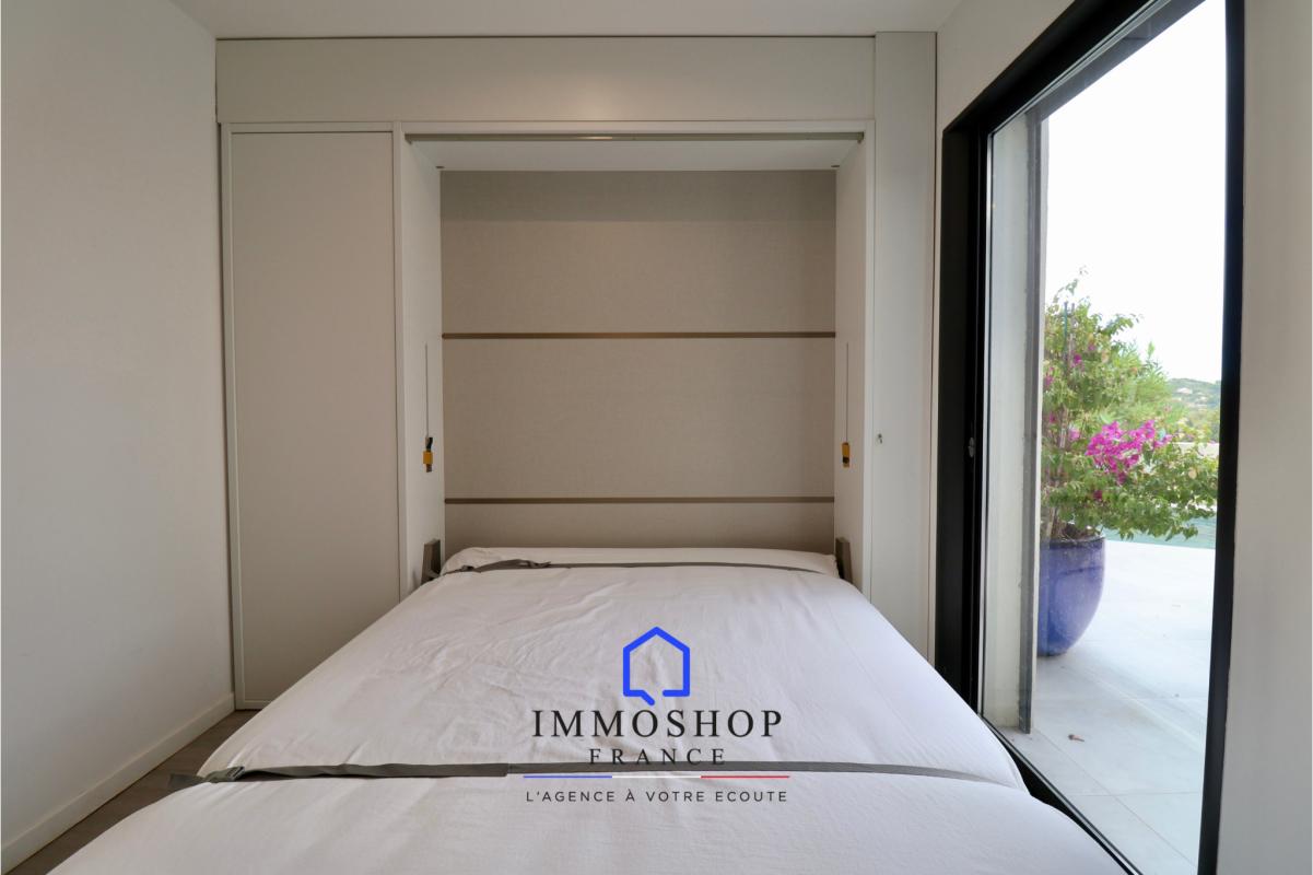 Celle-ci se compose au rez-de-chaussée d’une grande pièce de vie baignée de lumière par de grandes ouvertures et d’une cuisine ouverte équipée d’un îlot central donnant accès à la terrasse principale et la piscine. Sur ce même niveau se trouvent deux chambres, une salle de bain et W.C séparé ainsi qu’un bureau équipé d’un lit escamotable pouvant faire office de 4ème chambre. À l’étage se trouve une suite parentale avec W.C, salle d’eau et une terrasse offrant une vue panoramique à 180o.
